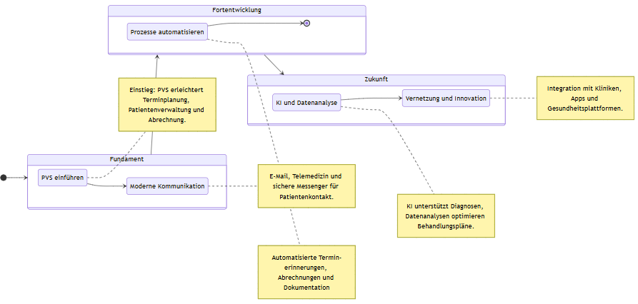 Die digitale Transformation in Arztpraxen kann in Etappen eingeteilt werden: Initialisierung, Implementierung, Integration und Optimierung sowie digitale Reife. Die Initialisierung schafft die technische Basis (z. B. Internet, Hardware) (Neunaber und Meister 2023), gefolgt von der Implementierung zentraler Systeme wie elektronische Gesundheitsakten und Schnittstellen zu anderen Leistungserbringer (Apotheken oder Laboren) (Teixeira u. a. 2023; Banas u. a. 2011). In der Integration und Optimierung werden fortgeschrittene Tools wie E-Rezept oder Telemedizin eingeführt, während Prozesse umgestellt werden (Bhyat u. a. 2021; Lowery 2020). Die digitale Reife wird durch interoperable Systeme und automatisierte Workflows erreicht (Neunaber und Meister 2023; Gehring, Rackebrandt, und Imhoff 2018). Trotz Variabilität durch Praxisgröße, Spezialisierung und Ressourcen – kleinere Praxen digitalisieren sequenziell, größere oft parallel – zeigt sich ein Muster: Der Prozess beginnt mit Infrastruktur, gefolgt von Kernsystemen, erweiterten Anwendungen und schließlich vernetzter Automatisierung (Neunaber und Meister 2023; Teixeira u. a. 2023; Bhyat u. a. 2021).